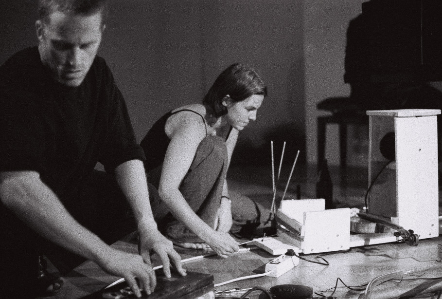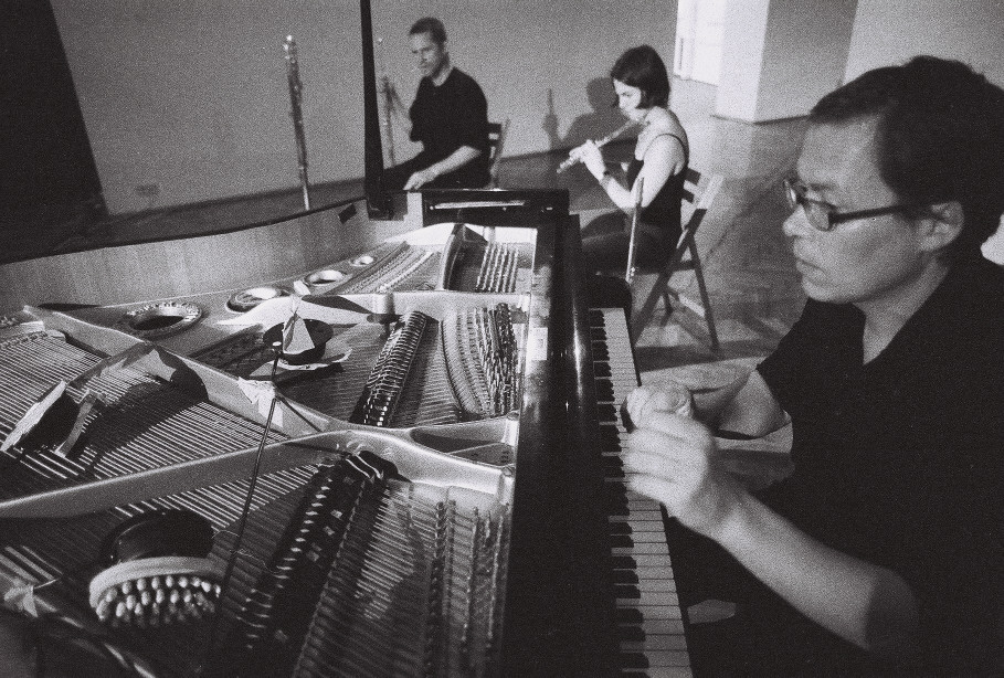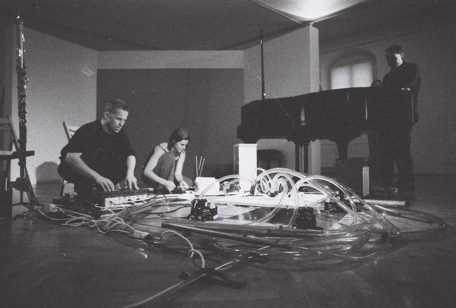 Automation - Okkupation![]() ![]() ![]() ![]() Die Arbeit wird weniger. Sie wird immer mehr von Maschinen erledigt. Sie verschwindet. Gleichzeitig werden immer mehr Bereiche des Alltäglichen professionalisiert. Und diese Welt der Professionalität hat den Charakter eines Apparates: sie stellt ein Programm bereit, etwas "vorher geschriebenes", eine Vorschrift. V. Flusser hat einleuchtend die beiden Wege beschrieben, die sich dem Menschen durch den Apparat eröffnen: er wird zum Funktionär des Apparates, bedient ihn; oder er spielt mit ihm, er bedient sich seiner. Die Musik kennt seit den Zeiten der Zwölftontechnik die Automation von Kreativität: Tonhöhen und in der Folge Rhythmen und alle anderen Parameter der Musik wurden durch mathematische Apparate erstellt. Die Automation auf dieser Ebene war immer großer Kritik ausgesetzt, bis sie durch Gewöhnung ihr Unheimliches verlor. Dazu beigetragen hat der nach öfteren Hören erkennbar begrenzte Spielraum dieser Technik, ihr Programm. Musik hat aber auch auf der Ebene der Ausführung immer mit Apparaten gearbeitet. Das Pianoforte wurde nicht zufällig in einer Zeit der Maschinenbegeisterung erfunden. Wir möchten in unserem Konzert mit Maschinen und Apparaten spielen und so verschiedene Aspekte dieses Verhältnisses erforschen. Dazu werden wir zuerst unsere Instrumente vollständig automatisieren. Einfache Maschinen die durch ihre Konstruktion ein großes Zufallselement integrieren, werden das erste Stück des Abends spielen. Wir werden zuhörend eine Partitur erstellen, das Maschinenstück also direkt dokumentieren und dieses Stück dann selbst spielen, um die Unterschiede zwischen maschineller Aktivität und menschlicher Handlung zu untersuchen. Mit dem so entstandenen Material werden wir dann in einem weiteren Stück "frei" umgehen, um den Aspekt der Gestaltung, der Intention in das Spiel zu bringen. Nach diesen Re-Okkupationen von Ausführen und Gestalten schließlich werden wir noch eine gemeinsame Improvisation mit einer schwer kontrollierbaren elektronischen Maschine, einem Zufallsgenerator, spielen. Ein Versuch der Versöhnung: das gemeinsame Spiel. Chris Weinheimer Uraufführung: 23. Juni 2005, Kunsthaus Dresden Neue Dresdner Kammermusik: Karoline Schulz (fl) Chris Weinheimer (v, fl) Frank Dresig (p) Fotos: Christoph Boosen, Dresden |