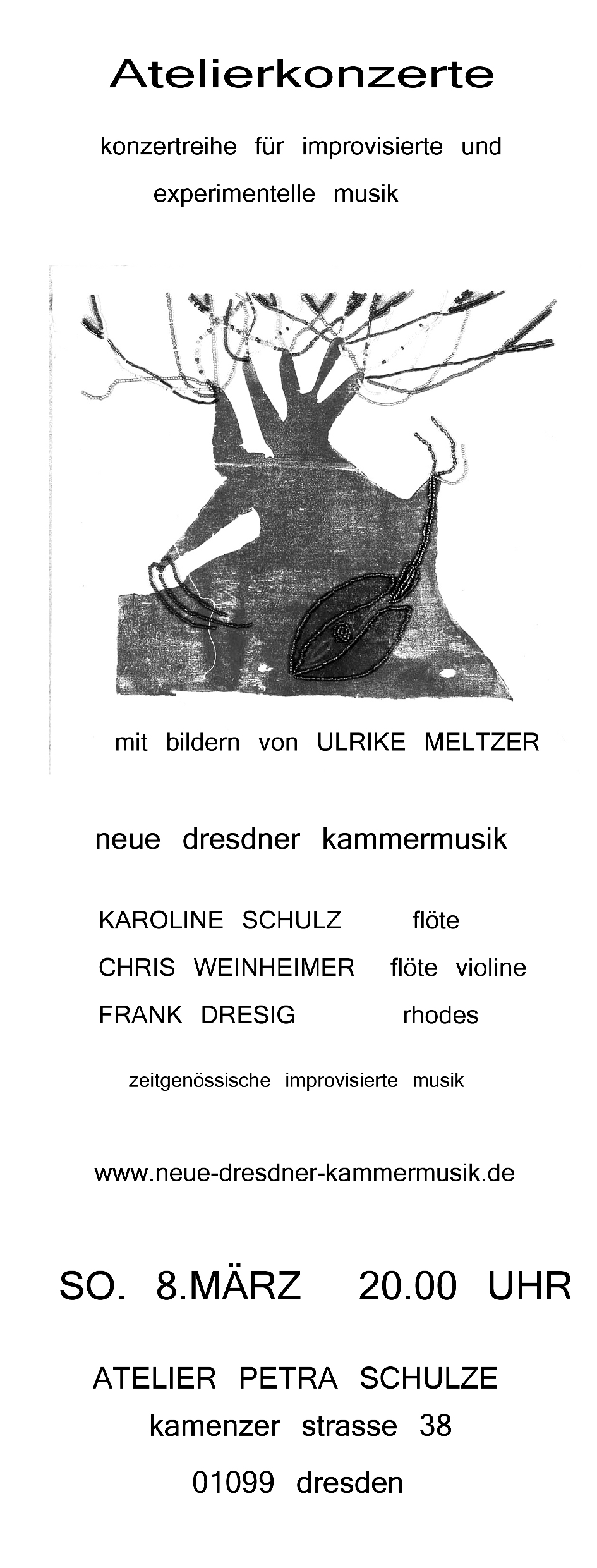 Presse"Das Feld zwischen Musik und Sprache", Radiosendung über einen Workshop der Neuen Dresdner Kammermusik von und mit Antje Meichsner, coloRadio, Dresden, 15.1.2022."F.D.: Da sind für mich auch die außermusikalischen Themen wichtig, mit denen wir uns in der Reihe beschäftigen. Diese Form des Umgangs mit Analogien aus der Physik, anderen Kunstformen und so weiter finde ich anregend, genauso wie unsere unterschiedlichen Backgrounds. ... K.Sch.: Aber das wichtigste bleibt doch das klangliche Resultat, trotz aller Konzepte. Das können eben nur Anregungen sein. Ch.W.: Mich interessiert dabei aber auch eine Ästhetik, die durch Nachvollziehbarkeit entsteht, eine Art "analytische" Musik. Sie entwickelt sich manchmal langsam und konzentriert, so daß der Hörer ihr minutiös folgen kann, sie hat aber auch Phasen der Turbulenz, die aber höchste Wachheit vom Spieler verlangen. ..." (Ausschnitt aus einem Gespräch in der Zeitschrift "positionen. Texte zur aktuellen Musik", Heft 69, 11/2006) "...eine Gruppe, die ... mittlerweile eine ganz eigene Klangsprache entwickelt hat." (SAX, Oktober 2005) "Sensibel, vielfältig und immer persönlich. Eine Spätschicht durfte einlegen, wer den Beitrag der "Dresdner Tage" zur improvisierten neuen Musik erleben wollte, die schon lange den Raum der Blauen Fabrik auf der Dresdner Prießnitzstraße füllt. Die Dresdner Komponistin und Flötistin Karoline Schulz ist in diesem Jahr eine der Stipendiaten des Europäischen Zentrums der Künste Hellerau. Da sie gleichzeitig Mitglied im Ensemble "Neue Dresdner Kammermusik" ist, das regelmäßig in der Blauen Fabrik Improvisationskonzerte durchführt, lag es nahe, einige der Stipendiaten und das Ensemble musikalisch aufeinandertreffen zu lassen. Der Titel "Zeiterscheinung" zielte wohl auf die Vergänglichkeit der Improvisationen selbst, das Genre sollte hoffentlich nicht gemeint sein. Berührungsängste unter den Musikern gab es keine, denn zur Arbeit der Stipendiaten in Hellerau gehörte Improvisation selbstverständlich dazu, was vielen "biederen" Kammermusikkursen gut zu Gesichte stünde. Die daraus folgende Interaktion, das Verständnis füreinander konnte bereits im Stipendiatenkonzert am Abend zuvor bewundert werden. Somit gelang auch ein homogener, stimmiger Eindruck. Man hatte kaum den Eindruck eines "ad-hoc-Ensembles", sondern begegnete Musikern, die allesamt mit dem Begriff Improvisation sensibel und vielfältig, aber immer auch persönlich umgehen. Dass sich im ersten, nahezu 60 Minuten währenden Stück dann doch einige undurchsichtige Passagen einschlichen, ist sicherlich den allesamt starken künstlerischen Persönlichkeiten zuzuschreiben. Fast zu ernst ging es da zu, die musikalische Dichte in dem heterogenen Ensemble aus mehreren Flöten, zwei Geigen, Akkordeon, Klavier und Schlagzeug war durchweg immens. Soli und Melodielinien hätten noch ein wenig stärker hervortreten können, außerdem war interessant zu bemerken, dass das Dresdner Ensemble vorrangig die leisen Nuancen beisteuerte, während die ebenfalls hervorragenden Musiker Sergej Tchirkow (Akkordeon), Sara Hubrich (Violine) und Jens Brülls (Schlagzeug) für deutliche, virtuose Akzente oder Pulsationen sorgten. Das zweite Stück dauerte dann nur wenige Minuten, wirkte wie ein Extrakt des ersten und sorgte damit für eine Abrundung des ebenso dramatischen wie entspannenden Abends." (Alexander Keuk, Dresdner Neueste Nachrichten, 6.10.2005) "Der erste Teil der diesjährigen Ausgabe vom "Festival Frei Improvisierter Musik" beginnt. Das Dresdner Trio ist mit dem einfallsreichen wie disziplinierten Chris Weinheimer an Bassquerflöte und Geige, Frank Dresig an Klavier und E-Bow sowie Schlagzeuger Matthias Macht als König der gebrochenen Schläge besetzt und spielt an diesem Abend extrem minimalistisch. Ein digitales Screening trägt sehr dazu bei, die musikalischen Strukturen konsequent zu reduzieren. Unheimlich inspirierend wirkt indes die Atmung eines Mannes, welche wie eine klaffende Wunde im Kammermusiksaal der Blauen Fabrik dazwischen hängt. Als das zehnköpfige "s.i.e." des sehr geschätzten Andreas Nordheim aufspielt, findet man sowohl Weinheimer als auch Dresig wieder." (Oliver Schwerdt, DNN, 28.9.2005) "Der Name "Neue Dresdner Kammermusik" mag etwas betulich klingen, vielleicht auch halb und halb ironisch gemeint sein, aber wenn der Begriff "Kammermusik" für die Intensität der musikalischen Kommunikation steht, dann trägt das, was diese kleine Gruppe erfahrener Improvisationsmusiker macht, den Namen mit vollem Recht. ... ... zeigten die drei, dass sie neben klanglicher Fantasie auch Gespür für unkonventionelle dramaturgische Verläufe besitzen, und in der Lage sind, einen bereits ausgesponnenen Spannungsbogen noch einmal neu zu beleben und vor allem statt des oft gehörten Auf und Ab von Ausbruch und Kontemplation sehr klar und gezielt mit den heftigeren Akzenten in ihrer ansonsten konzentrierten, nicht oberflächlich exzessiven Spielweise umgehen können." (Benjamin Schweitzer, DNN, 26.4.2004) "Augenklang, gleichsam ein Gespräch" ("Ringing of Eyes, resembling a Conversation") presented music by Karoline Schulz, paintings by Jochen Deutsch and video projection by Peter Herzog and Norbert Hupbach. In this case, the video projection, featuring abstract modernist paintings with vivid, motley colors and designs, was just about equal to if not exceeding the music, which was another well-built chamber composition, which combined expressive and cerebral qualities along with a very innovative and experimental approach to texture and sound. All three multi-media projects were very adequate in their artistic conceptions and their harmonious combination of music with other art forms, providing for some highly qualified music and creating a very pleasant and favorable impression." (Anton Rovner in "new music connoisseur", Vol. 12, No. 1&2 - Spring/Summer 2004.) "Augenklang" (17. Dresdner Tage der zeitgenössischen Musik): "... war die Abstra
